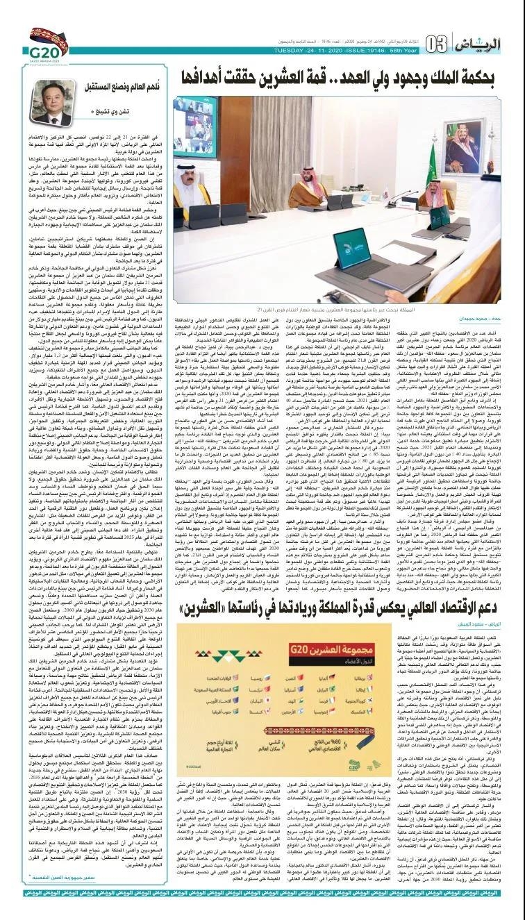 作为全面战略伙伴,中国和沙特在G20峰会相关议题上拥有广泛的共同立场,就后疫情时代的国际秩序和全球治理发出一致声音。