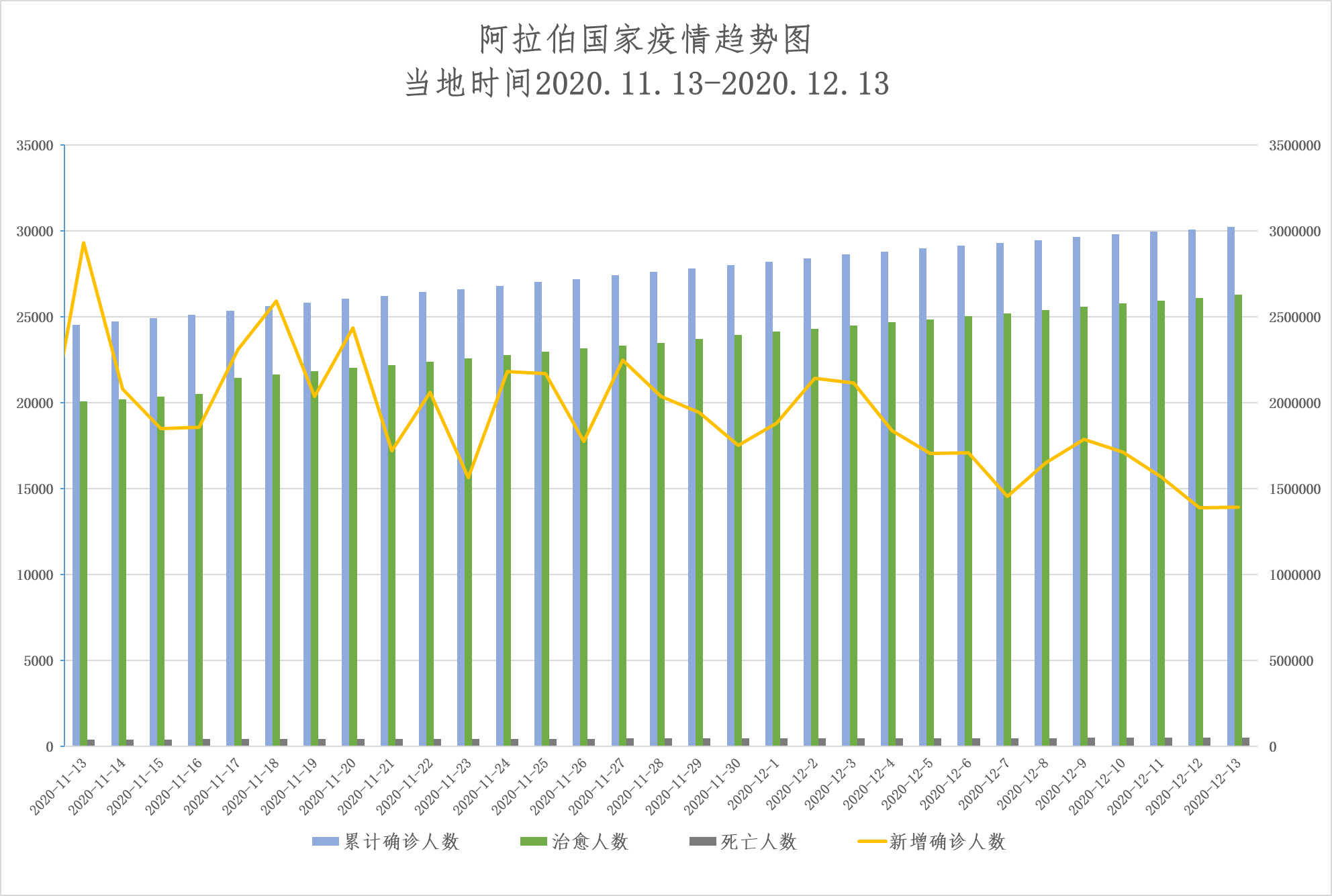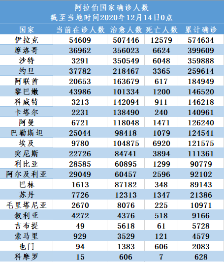 截至当地时间12月14日0点,阿拉伯国家累计确诊3022675例,死亡52076例,治愈2628599例,当前在诊342000例,较两周前(11月30日0点)累计新增241065例,疫情发展整体放缓。