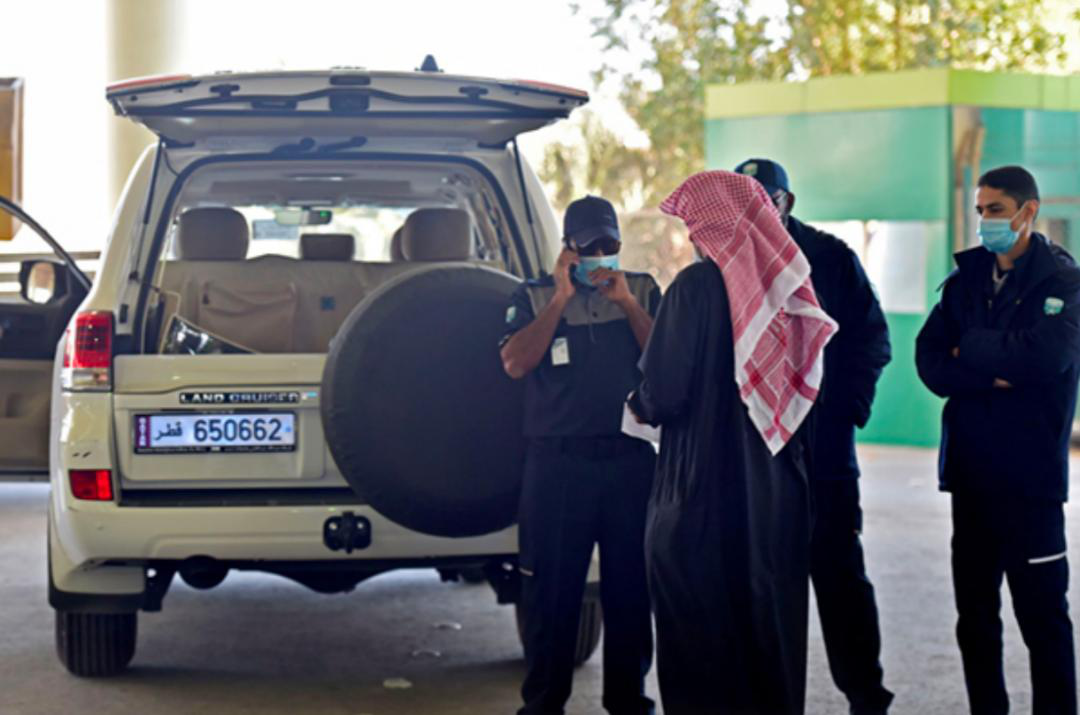 2021年1月10日,沙特阿拉伯萨尔瓦,民众接受海关检查后乘车进入卡塔尔。
