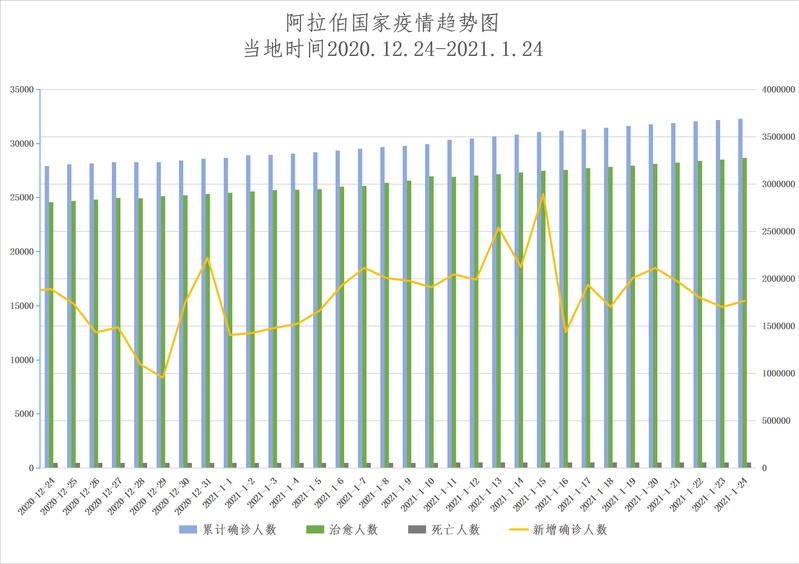 两周以来,沙特、科威特、卡塔尔、阿曼、巴勒斯坦、巴林、阿尔及利亚、苏丹、也门、吉布提、索马里、科摩罗疫情稳定。为遏制新冠疫情蔓延,沙特正在积极推进新冠疫苗大规模接种。目前,沙特已批准使用3款疫苗。科威特于1月14日启动新冠疫苗第二剂接种。卡塔尔卫生部16日宣布,疫情较先前有所缓解,但仍需严格执行现行防疫措施。1月17日,阿曼疫情防控最高委员会宣布,鉴于目前阿曼境外疫情形势严峻,决定自18日下午6时起,关闭陆路边境一周,待一周期满后或视具体情况再次延长。巴勒斯坦政府宣布,自15日起,将“封锁令”再延长两周,其中周五、周六实施24小时“彻底封锁”。巴勒斯坦卫生部19日表示,约旦河西岸和加沙地带疫情有所缓和,全国单日新增病例数连续12天降至1000例以下, 该国新冠患者康复率进一步提高,目前已达92.3%。截至1月19日,巴林已累计完成新冠肺炎病毒检测2563504人次。自巴林启动新冠肺炎疫苗接种工作以来,已累计有142831人完成接种。阿尔及利亚政府14日宣布,自16日起,继续实施为期15天的封禁措施。阿尔及利亚防治新冠科学委员会成员17日表示,本月内将获得50万剂俄罗斯新冠疫苗,同时将自18日起对新冠疫苗接种医务人员进行培训。