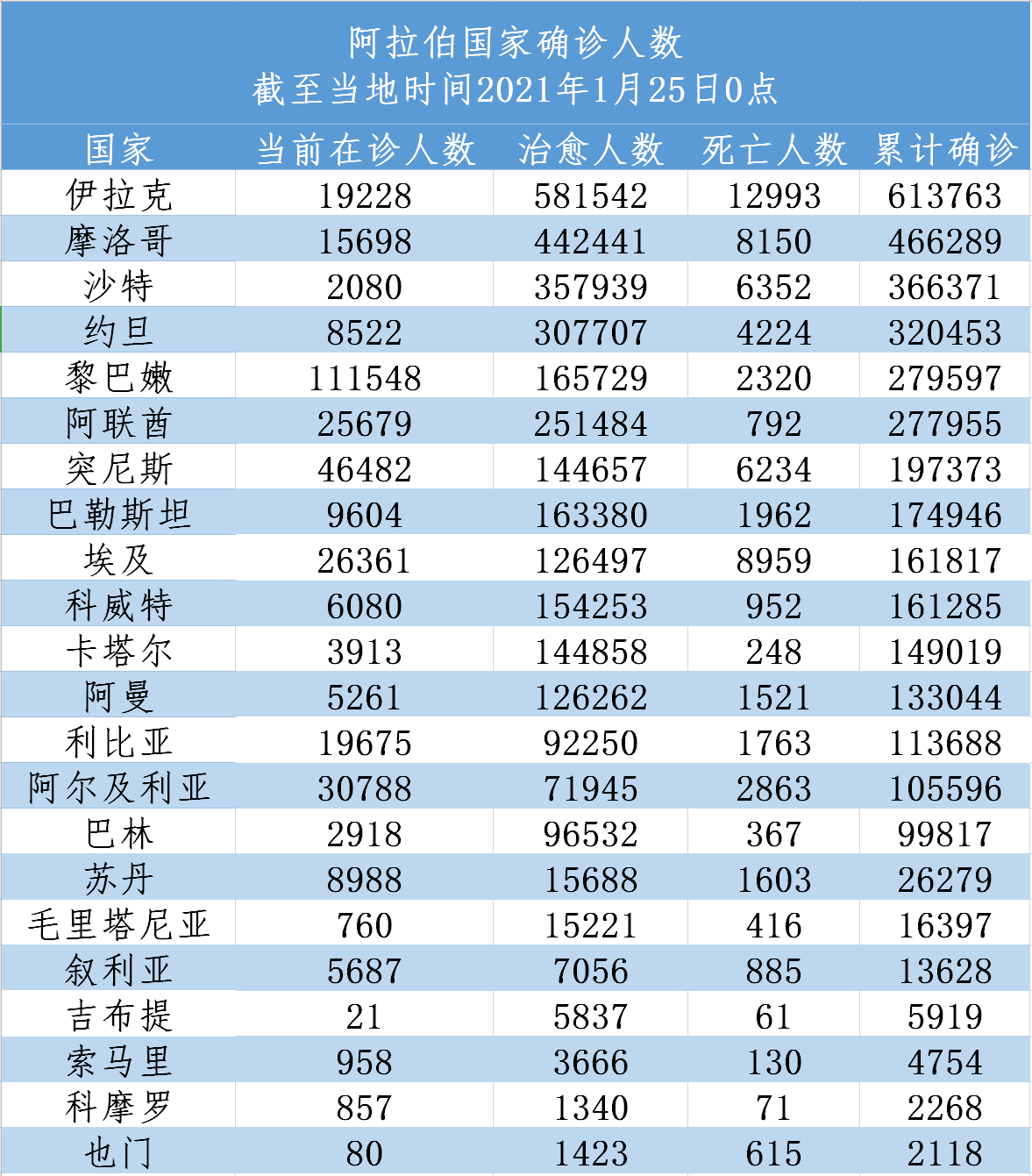 截至当地时间1月25日0点,阿拉伯国家累计确诊3692376例,死亡63481例,治愈3277707例,较两周前(1月11日0点)新增确诊270987例。目前,部分阿拉伯国家新冠疫情趋稳,但黎巴嫩、突尼斯等国新增确诊病例数持续攀升。多国继续推进疫苗接种。
