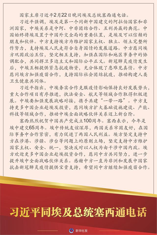 国家主席习近平2月22日晚同埃及总统塞西通电话。