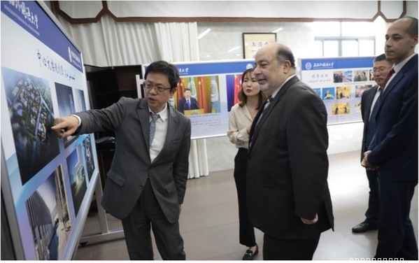 随后,阿齐兹总领事一行参观了中阿改革发展研究中心展示区,李岩松校长为其介绍中心成立四年多的发展历程与建设情况,尤其是中心与埃及各领域中高级官员、专家学者在治国理政、人文交流等方面的友好交流。今年正值中埃建交65周年,中心将于下月同中国驻埃及大使馆和埃及外交事务委员会联合主办双边关系研讨会。