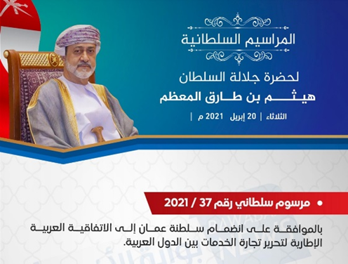 阿曼苏丹海赛姆颁布第37/ 2021号谕令,批准阿曼加入《阿拉伯国家服务贸易自由化框架协议》。该协议于2019年10月14日生效,旨在建立一个新的经济合作平台,促进阿拉伯国家之间实现更深层次的经济一体化。