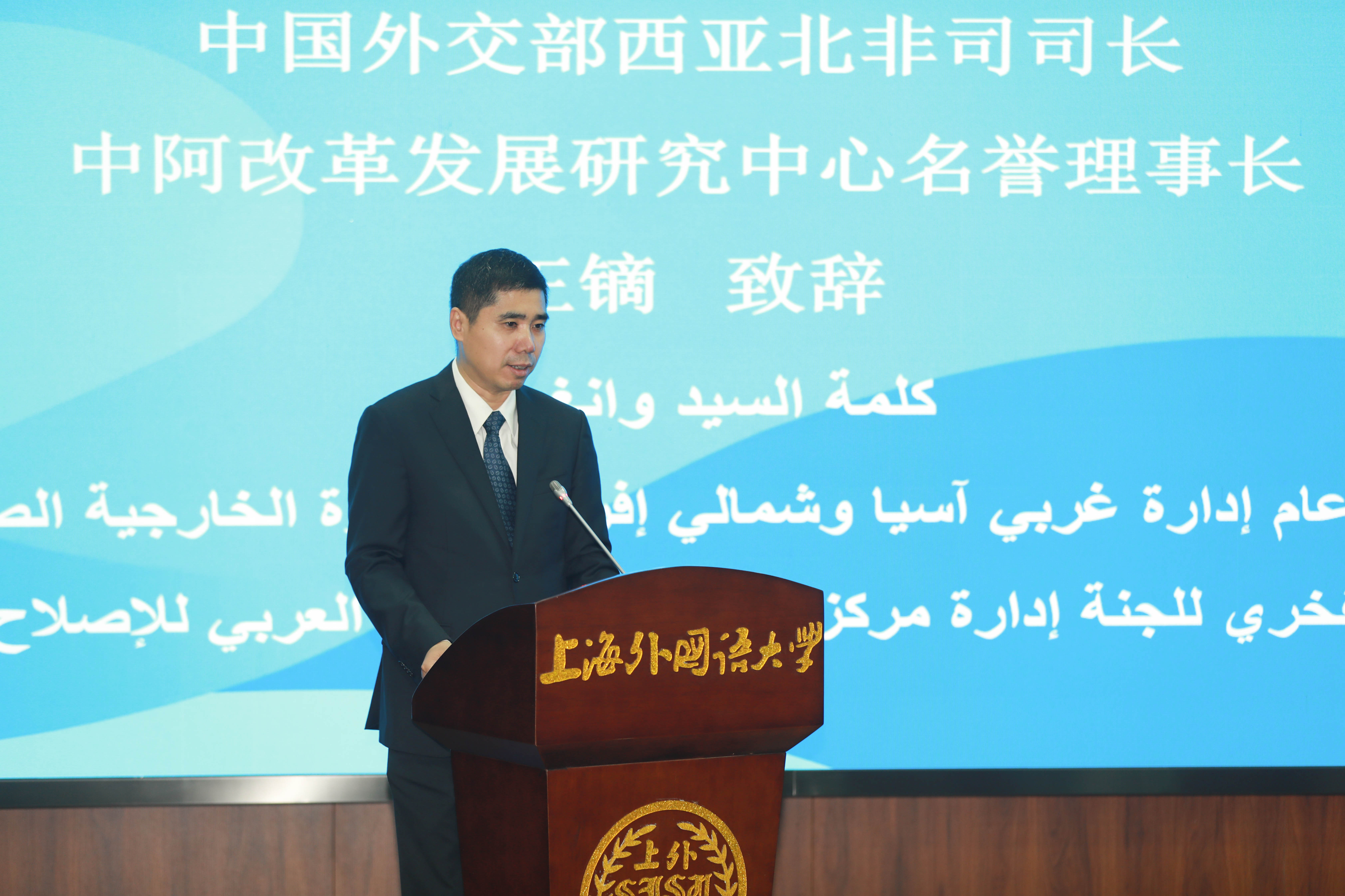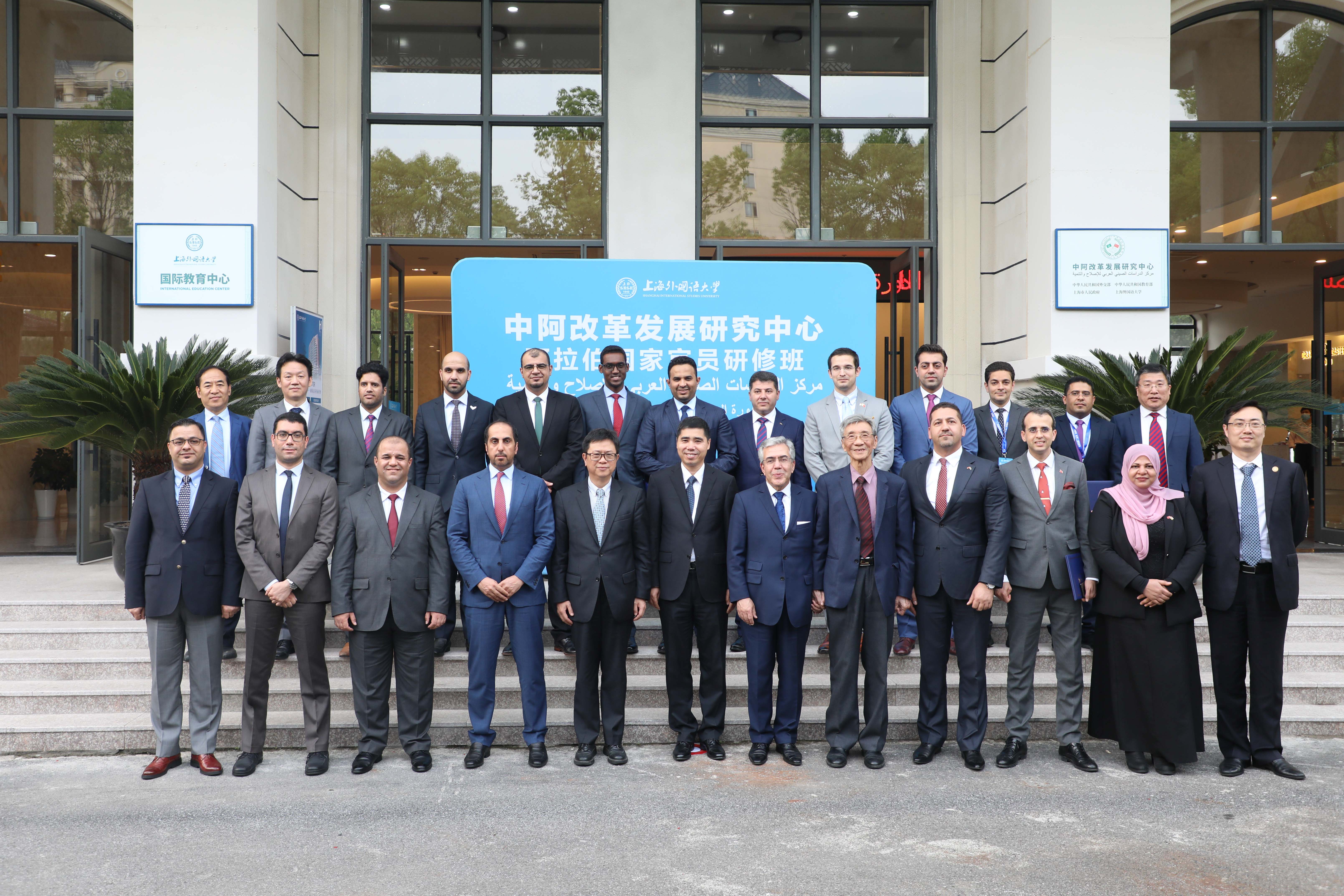 5月27日下午,阿拉伯国家驻华外交官研修班结业仪式在上外松江校区国际教育中心举行。外交部西亚北非司司长、中阿改革发展研究中心名誉理事长王镝,阿拉伯国家驻华使团团长、阿尔及利亚驻华大使艾哈桑·布哈利法,上海外国语大学校长、中阿改革发展研究中心理事长李岩松,外交部亚非司论坛及多边事务处处长兼参赞、中阿改革发展研究中心理事赵亮,中阿改革发展研究中心专家委员会主任朱威烈教授,上海外国语大学科研处处长、中阿改革发展研究中心副主任王有勇教授,上海外国语大学中东研究所所长、中阿改革发展研究中心兼职教授丁俊,上海外国语大学高翻学院教授、中阿改革发展研究中心兼职教授郭子建及研修班全体学员出席结业仪式。结业仪式由中心理事会秘书长、执行主任王广大主持。