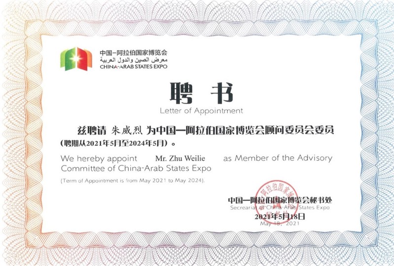 近日,中阿改革发展研究中心专家委员会主任朱威烈教授受聘为中国-阿拉伯国家博览会顾问委员会委员,聘期为2021年5月至2024年5月。