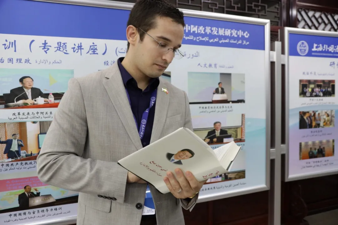 阿尔及利亚驻华使馆二秘赫鲁飞·比拉勒在中阿改革发展研究中心翻阅阿文版《习近平谈治国理政》第二卷