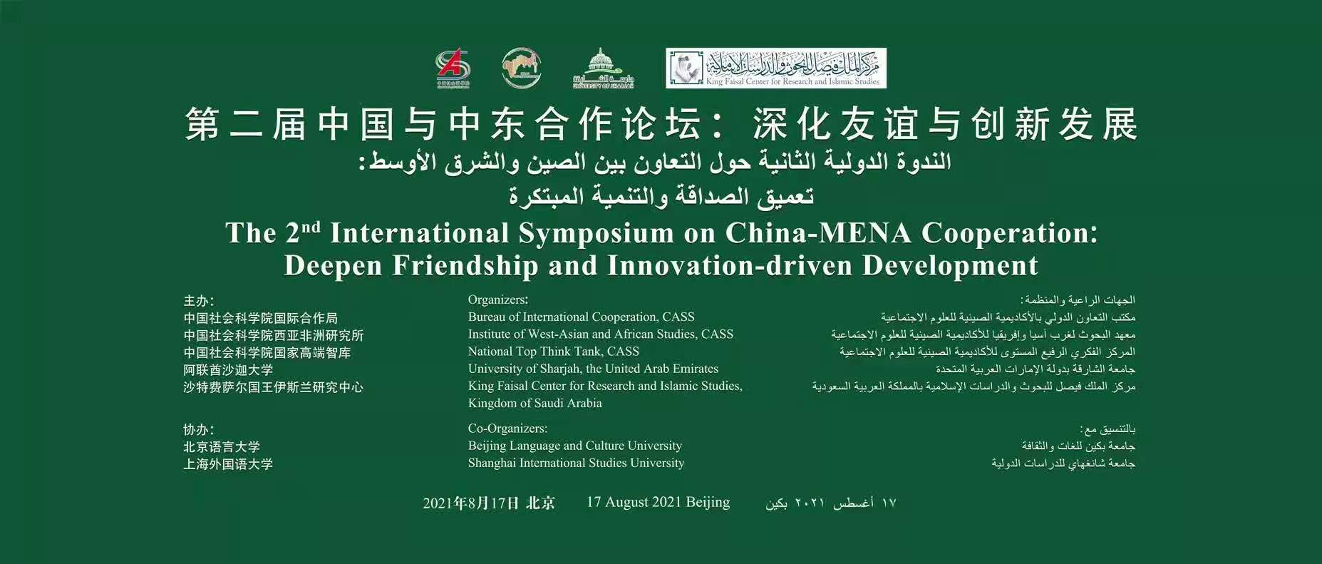 2021年8月17日,“第二届中国与中东合作论坛”以线上线下相结合的方式举行。论坛主题为“深化友谊与创新发展”。中国社会科学院院长、中国社会科学院国家高端智库理事长谢伏瞻,中国社会科学院副院长、中国非洲研究院院长王灵桂,沙特阿拉伯费萨尔国王伊斯兰研究中心主席图尔基·费萨尔亲王、中国政府中东问题特使翟隽、中国前中东问题特使吴思科、外交部中阿合作论坛事务大使李成文等出席活动。中阿改革发展研究中心王广大教授出席活动并在第二议题“中国与中东国家科技创新合作与人文交流”发言。