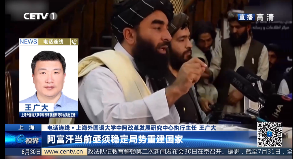 2021年8月30日,中阿改革发展研究中心王广大教授就喀布尔机场爆炸、阿富汗局势等问题接受中国教育电视台采访,发表四点评论。