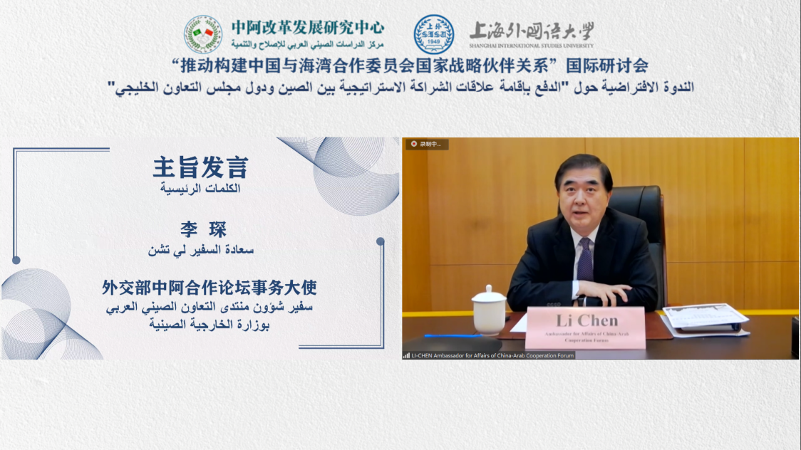 519中阿改革发展研究中心成功举办“推动构建中国与海湾合作委员会国家战略伙伴关系”线上国际研讨会来自中国沙特阿联酋、科威特卡塔尔、阿曼巴林、苏丹埃及、伊拉克等国的40余位大使、专家学者出席。上海外国语大学校长李岩松致开幕辞,外交部中阿合作论坛事务大使李琛,沙特科研与知识交流中心主席叶海亚··朱奈德,上海国际问题研究院学术咨询委员会主任杨洁勉作主旨发言。阿曼苏丹国驻华大使纳赛尔·布赛义迪作为海合会国家驻华大使代表出席开幕式