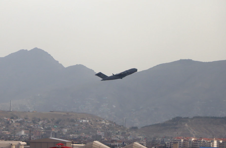 (2021年8月30日,一架美军飞机从喀布尔哈米德卡尔扎伊国际机场起飞,图片来源:路透社)