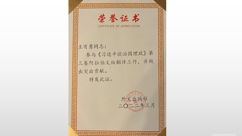日前,中阿改革发展研究中心理事王有勇教授收到外文出版社发来的荣誉证书,表彰其参与《习近平谈治国理政》第三卷阿拉伯文版翻译工作所做出的突出贡献。