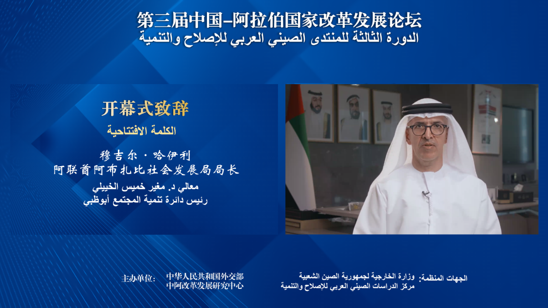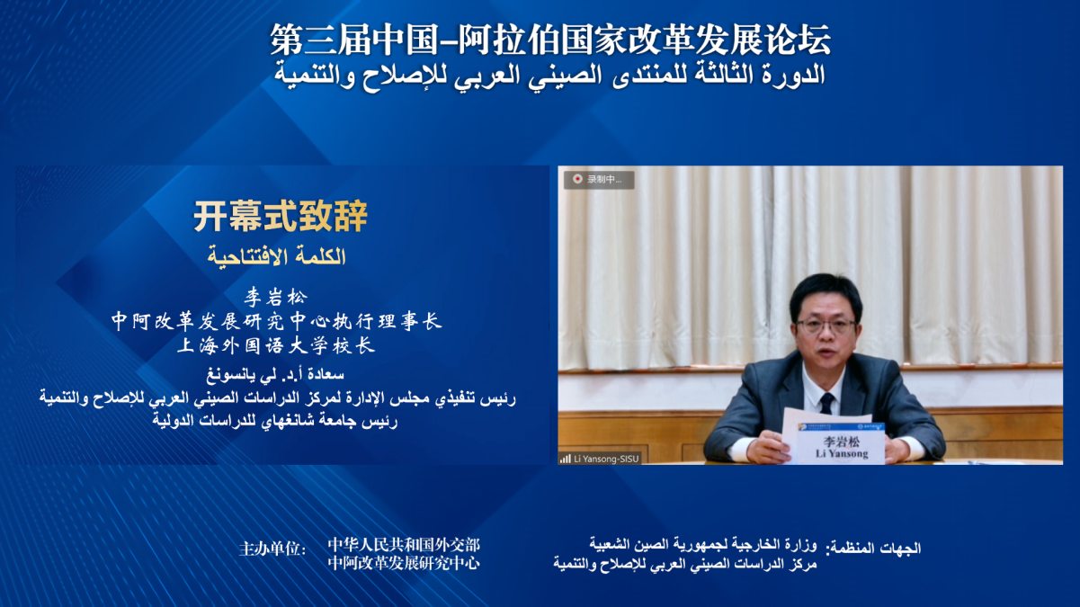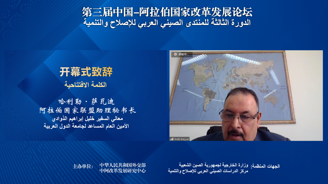 98日,外交部依托中阿改革发展研究中心举办第三届中国–阿拉伯国家改革发展论坛,来自中国以及埃及、阿联酋、沙特、卡塔尔、伊拉克、也门、巴勒斯坦、黎巴嫩、苏丹、阿尔及利亚、摩洛哥等国的20余位专家学者参会。中国政府中东问题特使翟隽、阿盟助理秘书长哈利勒·萨瓦迪、阿联酋阿布扎比社会发展局局长穆吉尔·哈伊利、上海外国语大学校长李岩松出席开幕式并致辞,外交部中阿合作论坛事务大使李琛主持会议。沙特科研与知识交流中心主席叶海亚··朱奈德和中阿改革发展研究中心理事会秘书长王广大分别主持“加强发展战略对接,携手推进全球发展倡议”、“坚持创新驱动,实现强劲、绿色、健康的发展”两大议题。
