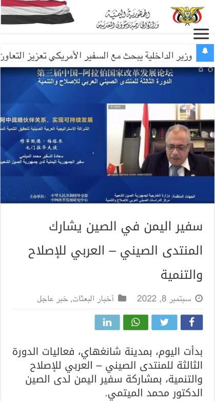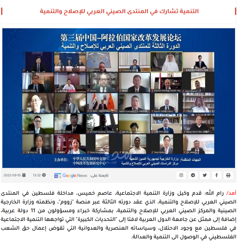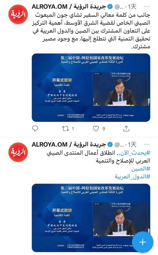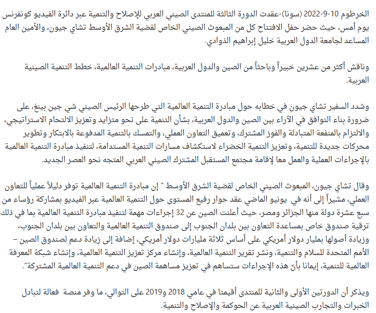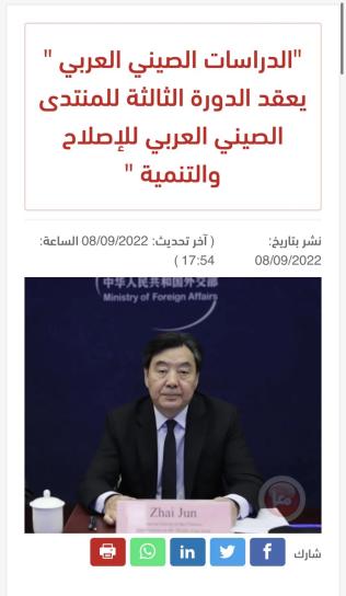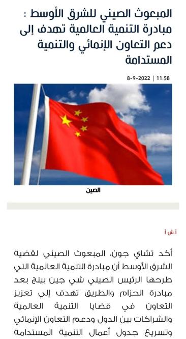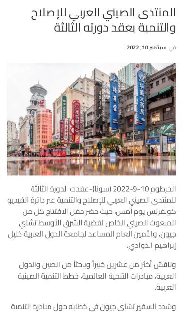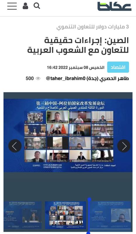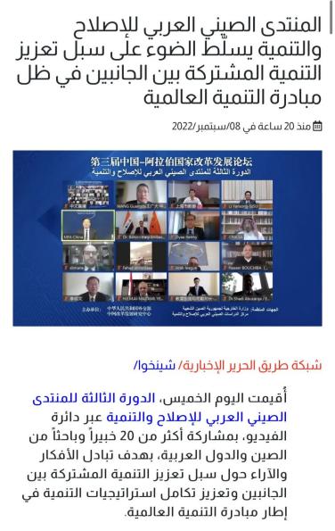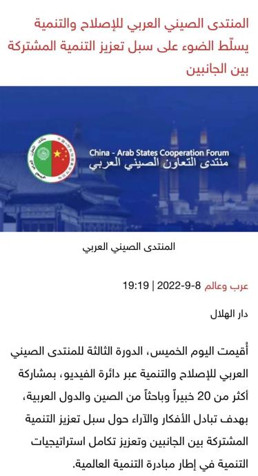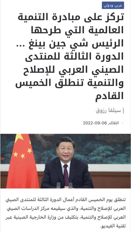 9月8日,第三届中阿改革发展论坛成功举办。中阿主流媒体第一时间密集报道。除《人民日报》、新华社、CGTN阿语频道、今日中国等中方主流媒体报道外,此次论坛同样引发阿拉伯多国主流媒体广泛关注。数十家阿方主流媒体高度赞赏全球发展倡议,认为此次论坛恰逢其时,极具开创性和示范意义,期待中阿双方继续汇聚合力促发展,谱写中阿合作新篇章。