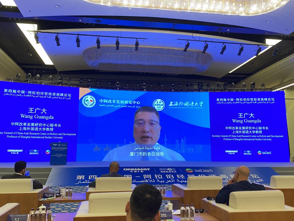 9月7日,由中国日报社、福建省商务厅指导,迪拜中阿卫视、中国对外政务信息服务平台、漳州古雷港经济开发区管委会主办的第四届中国—阿拉伯国家经贸投资高峰论坛在福建省厦门市举办。此次高峰论坛以“创新驱动,构建全球发展命运共同体”为主题,是第二十二届中国国际投资贸易洽谈会的平行论坛。中阿改革发展研究中心秘书长、上海外国语大学教授王广大受邀线上参加论坛并做主题发言。