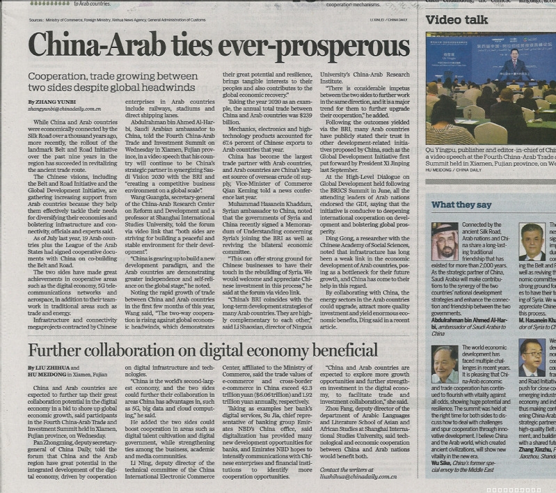 日前,中心秘书长王广大教授就第四届中国-阿拉伯国家经贸投资高峰论坛接受《中国日报》采访。全文见《中国日报》2022年9月8日第7版,翻译如下: