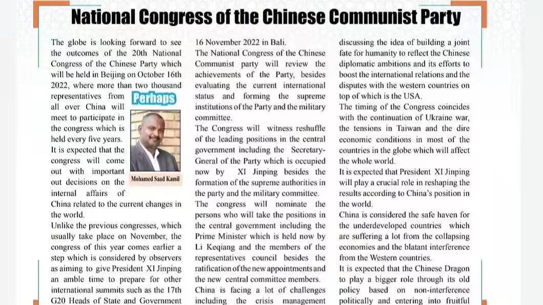苏丹记者穆罕默德·萨阿德发表题为《中共二十大》的文章。他在文章中指出,全世界都期待着中共二十大将取得的丰硕成果,习近平主席也将在重塑国际社会关系方面发挥重要作用。他提到,一些经济崩溃且受到西方国家干涉的发展中国家,视中国为避风港,这从另一方面证明了中国这些年的蓬勃发展以及中国对于发展中国家的重要意义。