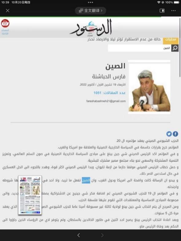 约旦学者法里斯·哈巴什内在约旦《宪章报》撰文评论中共二十大。法里斯在文章中指出,中共二十大的成功举办以及对于台湾问题的表态,证明中国是独立自主的国家,其政策与会议议程不受外国影响。他还认为,中国未来发展对于世界有重大影响,通过西方媒体了解中国是片面的,中国已经崛起,且非常发达。习近平主席的执政理念经受住了实践的考验,中国的全球化思维已经落实到具体项目中,如“一带一路”建设等。