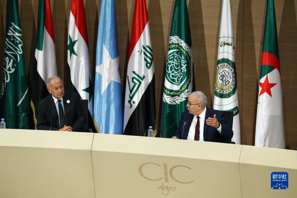 11月2日,在阿尔及利亚阿尔及尔,阿尔及利亚总统特本(右)与阿盟秘书长盖特参加第31届阿拉伯国家联盟首脑理事会会议。新华社发(阿尔及利亚总统府供图)