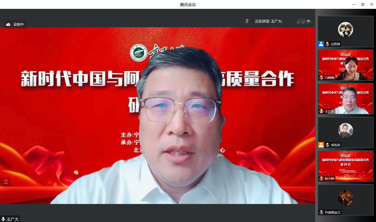 1226日,中阿改革发展研究中心秘书长王广大在宁夏大学主办的新时代中国与阿拉伯国家高质量合作研讨会上做“加强新时代中阿高质量减贫合作经验交流”的主旨发言。