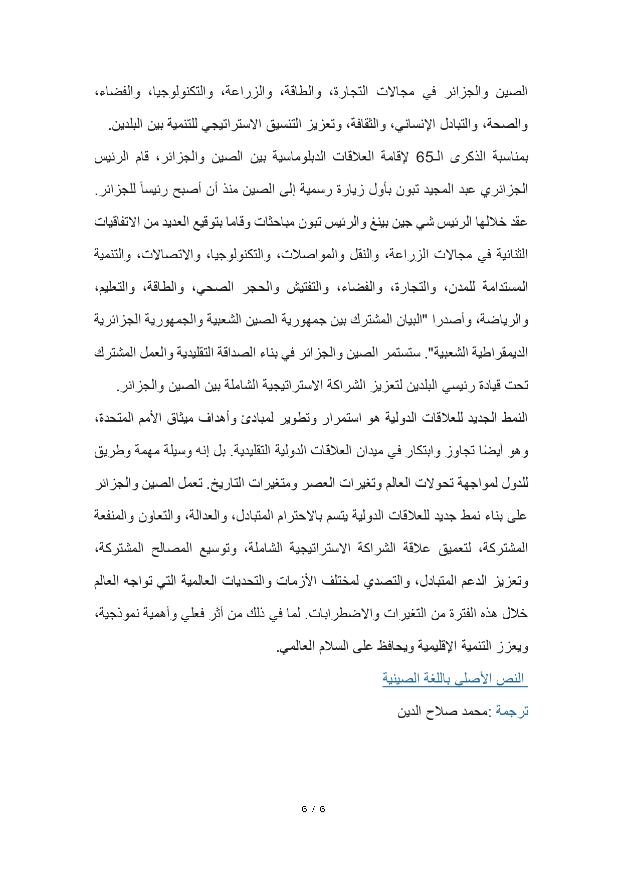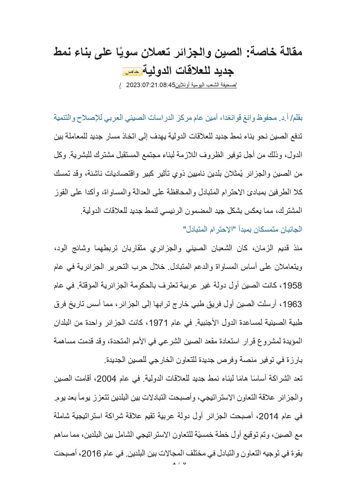 7月21日,人民网阿文版发表中阿改革发展研究中心秘书长王广大教授文章:《中国和阿尔及利亚共同构建新型国际关系典范》。原文登载于人民网国际频道,阿文版由上海外国语大学中东研究所苏丹籍博士研究生周瑜翻译,详情如下: