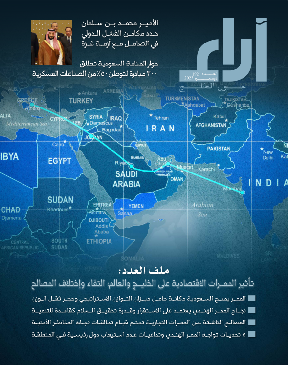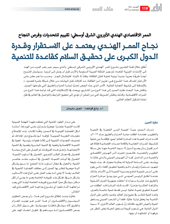 近日,中阿改革发展研究中心秘书长王广大教授、叙利亚籍中阿关系学者卢冉在沙特学术月刊《海湾观点》第192期发表阿文文章《印欧走廊的成败取决于地区稳定和大国是否把实现和平作为发展的原则》(第118-122页)。文章摘要如下: