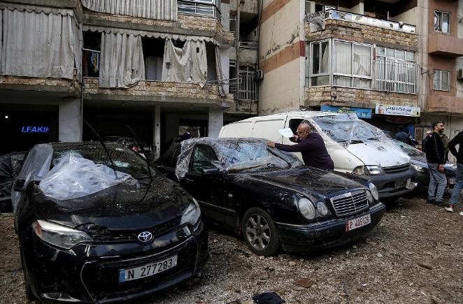 一名黎巴嫩男子检查被毁汽车(图片来源:视觉中国)