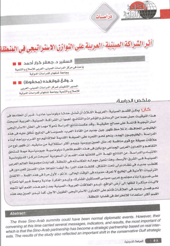 近日,中阿改革发展研究中心研究员加法尔·卡拉尔教授、中心秘书长王广大教授,在埃及著名国际事务学术期刊《国际政治》发表阿文论文《中阿伙伴关系对中东战略平衡的影响》,论文摘要如下: