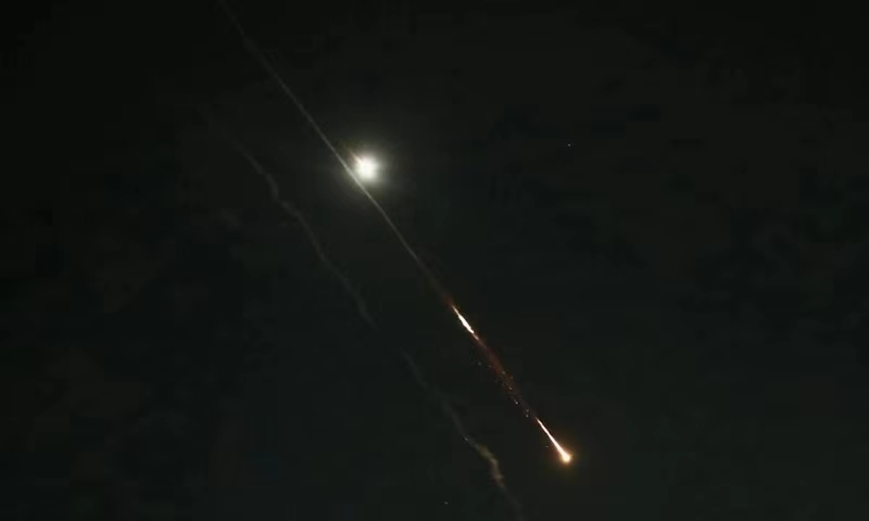 This photo taken on April 14, 2024 shows flares from explosions in the sky over Jerusalem as Israel's Iron Dome anti-missile system intercepts missiles and drones from Iran. A combined attack of dozens of ballistic missiles and hundreds of drones from Iran triggered air raid alerts across Israel early on Sunday, the Israeli army said, as residents reported multiple bombings were heard. Photo: Xinhua