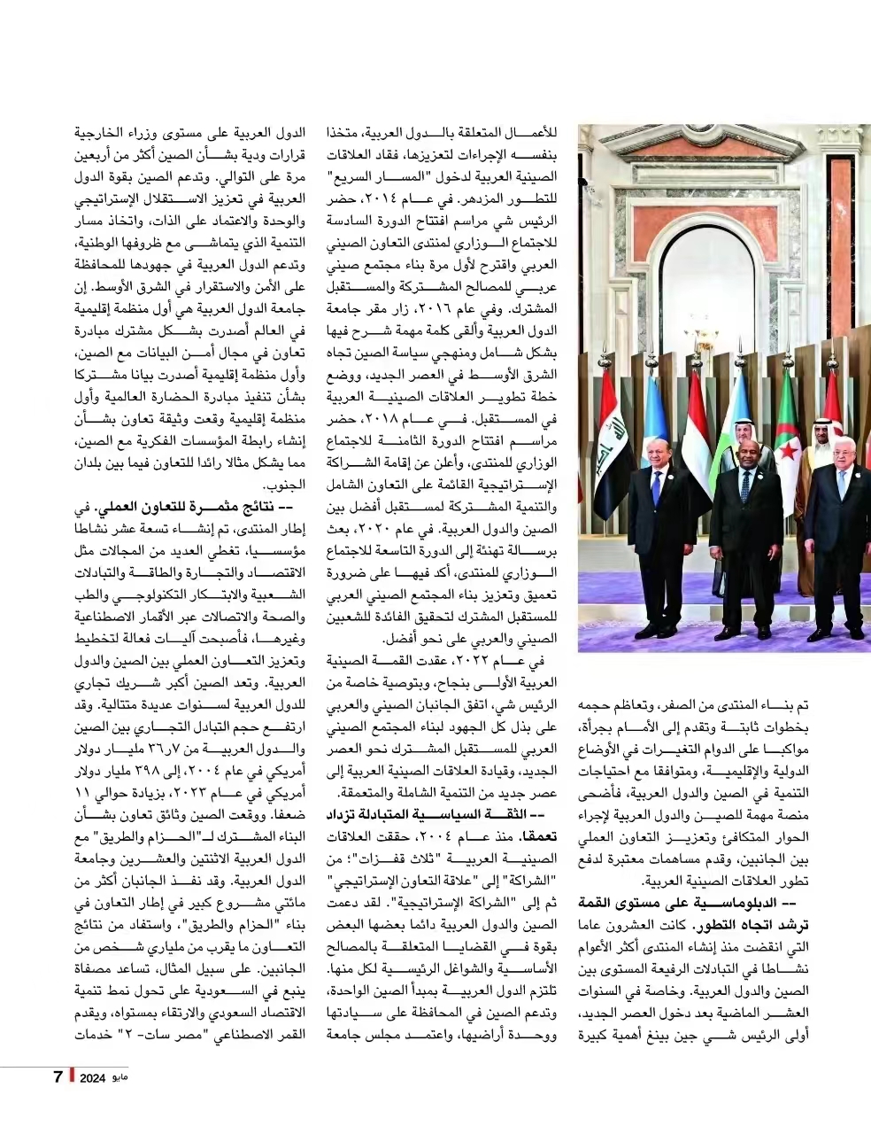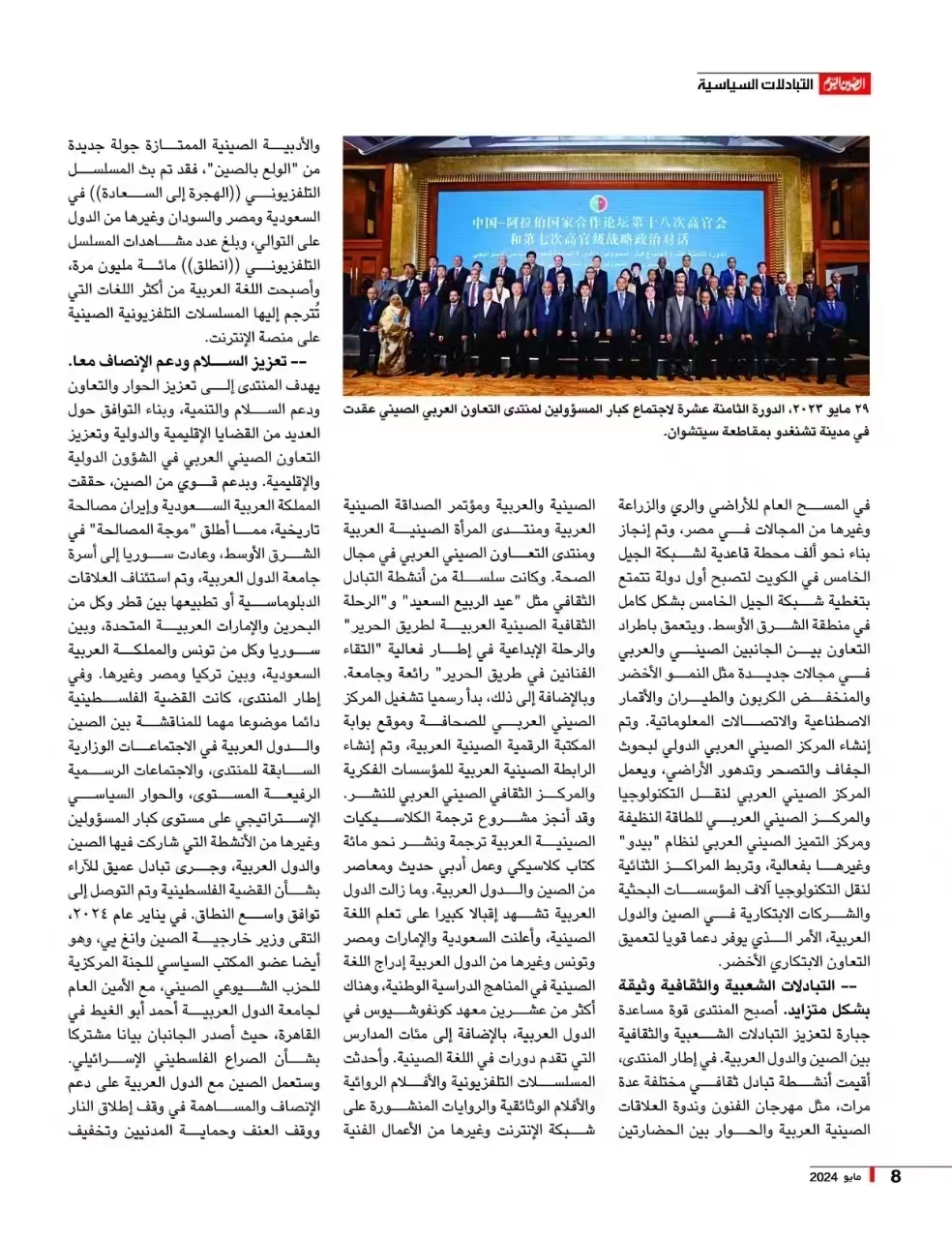 2024年是中国-阿拉伯国家合作论坛成立二十周年。二十年来,在元首外交引领下,论坛始终秉持“加强对话与合作、促进和平与发展”宗旨,已成为促进中阿双方开展集体对话与务实合作的“金字品牌”,为推动中阿关系作出重要贡献,树立了南南合作的成功典范。