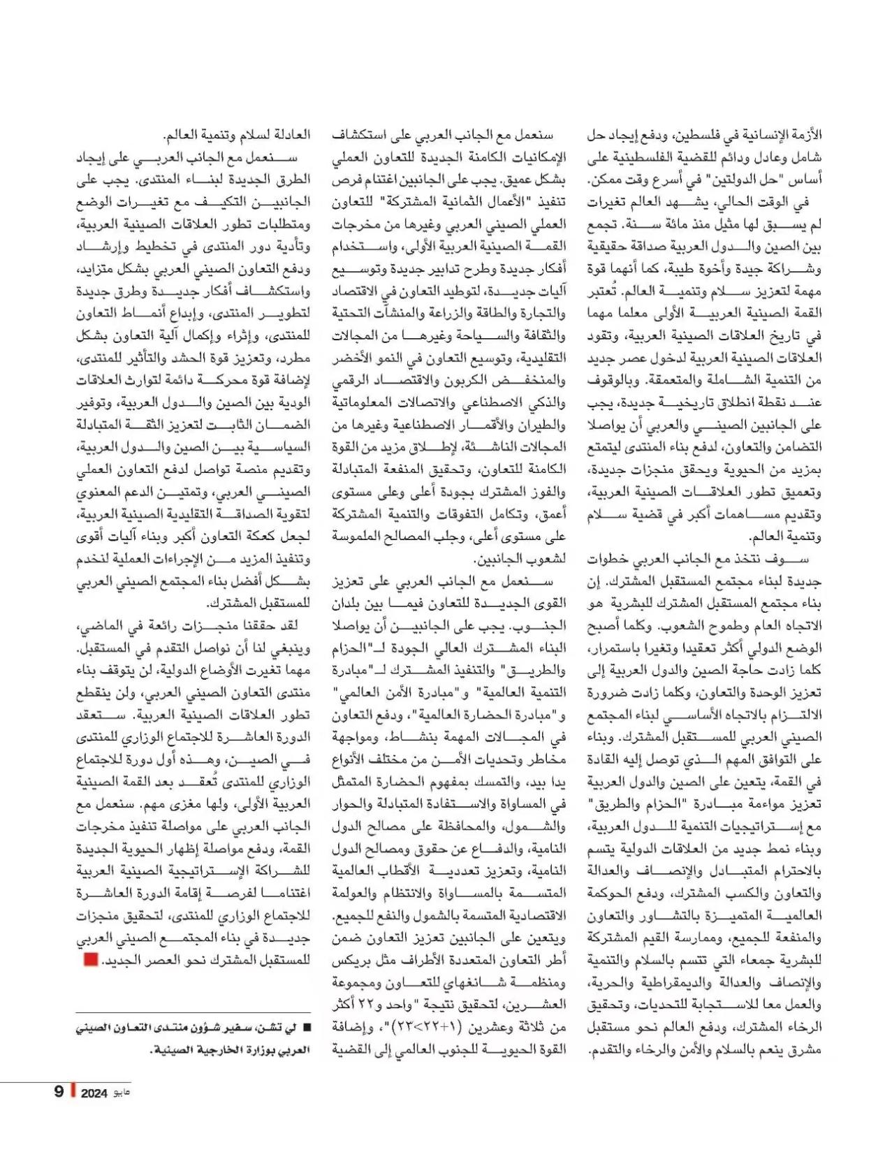 专栏首篇推出的是外交部中阿合作论坛事务大使李琛的文章《春华秋实二十载,命运与共谱新篇》。该文首发于中阿改革发展研究中心与《今日中国》杂志社共同策划出版的庆祝中阿合作论坛成立二十周年5月号正刊《新时代的中阿关系》。