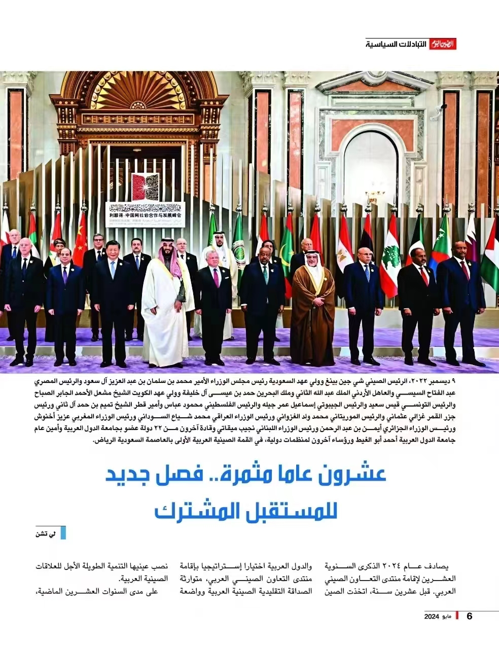 2024年是中阿合作论坛成立二十周年。20年前,中国和阿拉伯国家传承中阿传统友谊,着眼中阿关系长远发展,共同作出成立中阿合作论坛的战略选择。20年来,论坛建设从无到有,由小及大,稳步推进,敢为人先,始终紧跟国际和地区形势变化,始终紧贴中阿双方发展需求,已成为中阿双方开展平等对话、加强务实合作的重要平台,为促进中阿关系发展作出重要贡献。