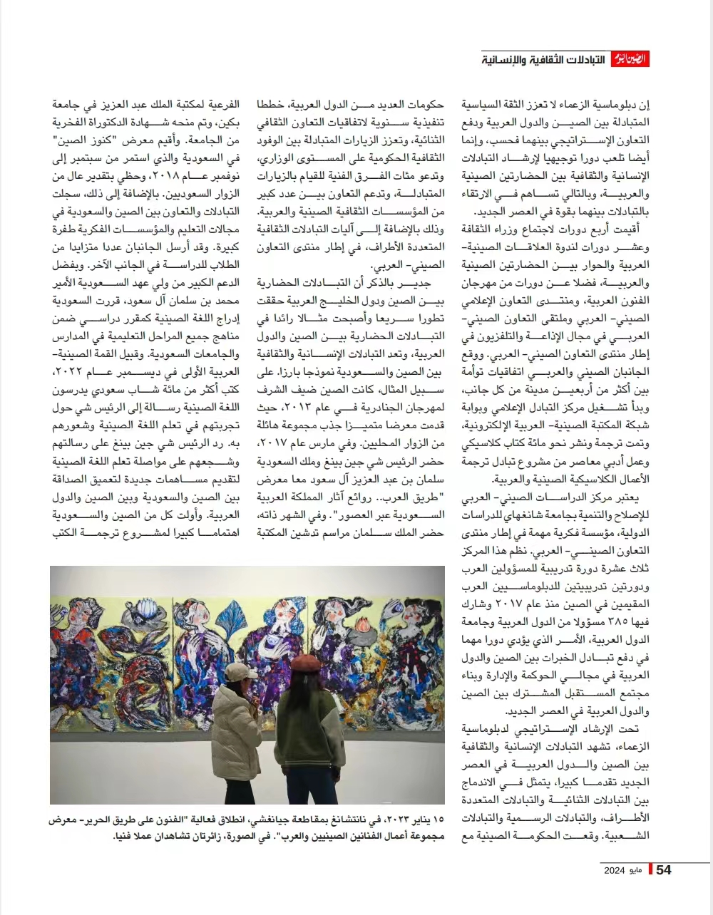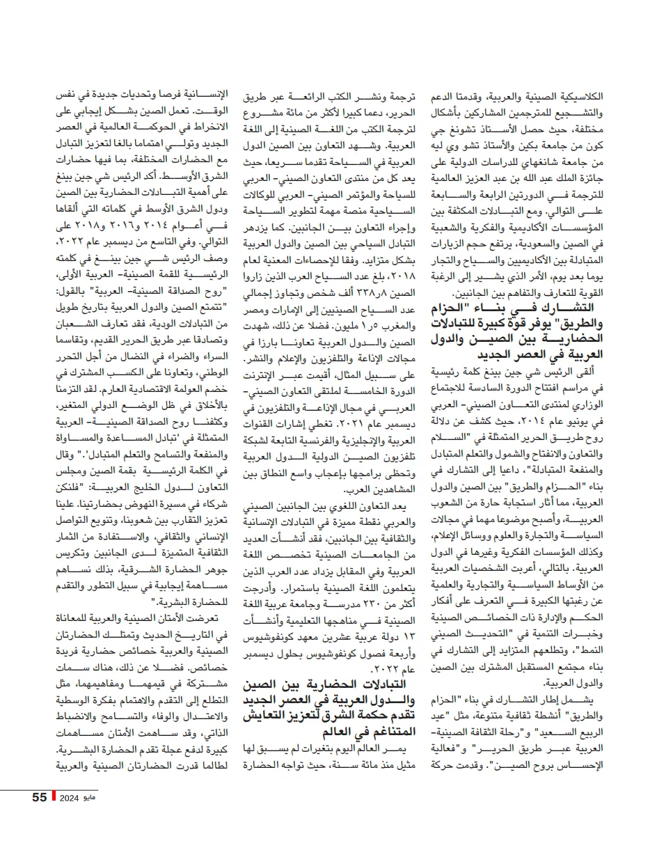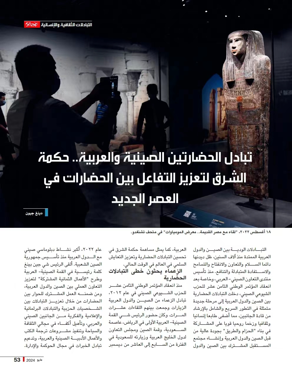 中国与阿拉伯国家的友好往来与文明交流源远流长,和平合作、开放包容、互学互鉴、互利共赢始终是中阿交往的主旋律。自中阿合作论坛成立以来,特别是十八大以来,在元首外交引领下,新时代的中阿文明交流进入提质升级、全面发展的新阶段,为中阿携手合作高质量共建“一带一路”、推动构建中阿命运共同体不断注入丰富人文滋养和强大精神动力,也为当今世界文明交往交流与和合共生贡献出宝贵的东方智慧。