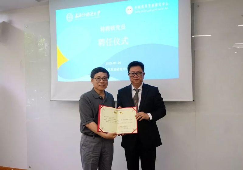 访问期间,上海外国语大学校长、中阿改革发展研究中心主任李岩松为旷伟霖大使颁发中阿改革发展研究中心特聘研究员证书。李岩松校长对旷伟霖大使回到母校表示欢迎,期待他凭借丰富的外交经验和对中非合作发展的独到见解,助力中心发展。中阿改革发展研究中心执行主任王广大主持聘任仪式。