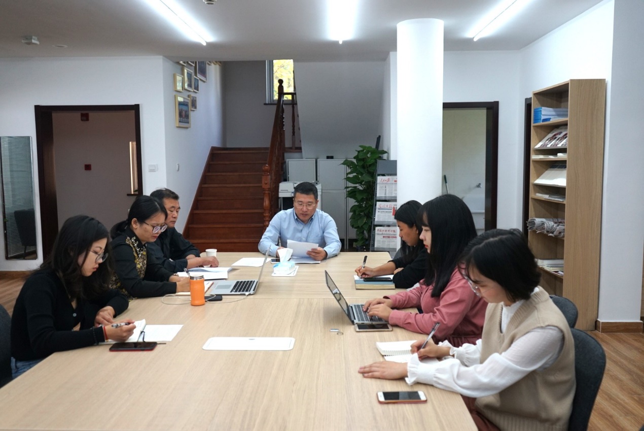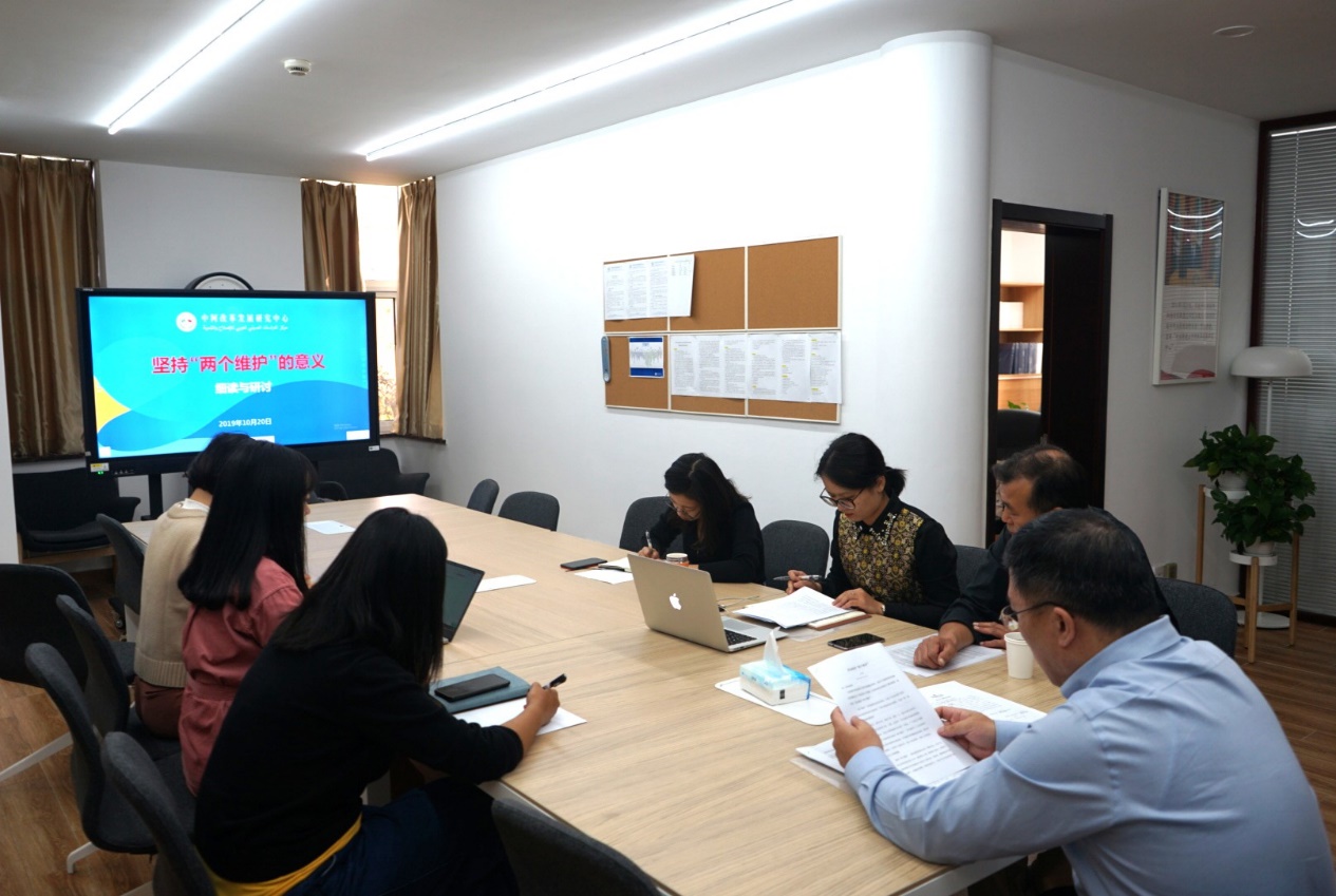 10月20日中午,中阿改革发展研究中心办公室(以下简称“中心”)党员在上外松江校区26号小别墅开展“坚持‘两个维护’的意义 细读与研讨”主题学习活动。中心办公室主任王广大及中心党员集体学习相关文件,并结合当前的工作进行自我检讨,为接下来的工作制定更完善的计划。