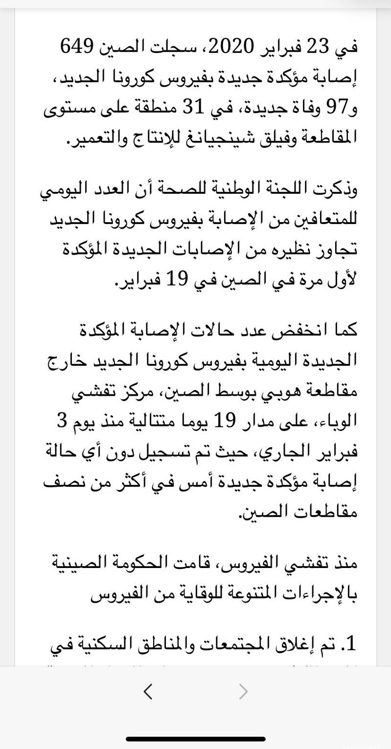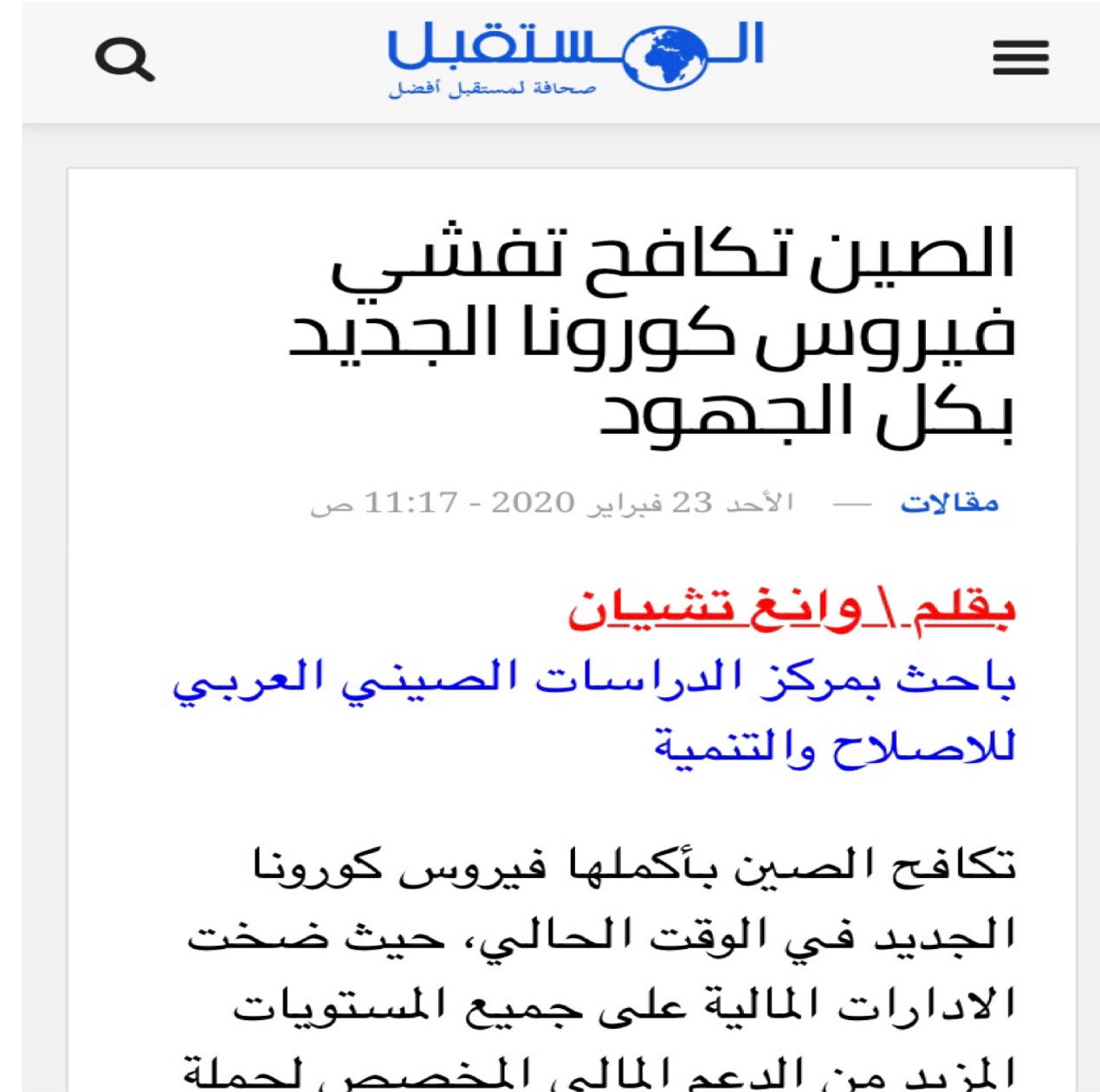 2月23日,中阿改革发展研究中心实习研究员汪倩在埃及“未来”网站发表名为《中国全力抗击新冠病毒疫情》的文章,介绍中国抗击新冠肺炎疫情举措,与阿拉伯国家共享防疫经验。
