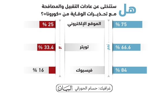 《宣言报》通过网站、脸书、推特等官方渠道发起调查:是否应为预防病毒放弃亲吻礼和握手?调查结果如下:网站(是75%,否25%),推特(是66.6%,否33.4%),脸书(是84%,否16%),表明多数居民认为在日常生活中预防病毒十分关键。相关专家表示,由于新冠病毒传播速度快,易感染,因此避免亲吻礼、碰鼻礼等直接接触可有效进行预防。此外,还应避免人群聚集,外出后应洗手和消毒。