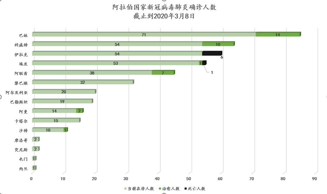 3月8日,八个阿拉伯国家出现新增确诊病例,共计71例,其中33例来自埃及卢克索一艘豪华游轮。目前各国防控措施主要集中在取消聚集性活动、对公共场所进行消毒、加强入境口岸管理等方面,但对民众是否要加强个人防护,如佩戴口罩等尚未做出硬性规定。随着中国国内疫情逐步得到控制,中国已着手向阿拉伯国家提供紧急人道主义援助,在全球抗疫中展现大国担当。