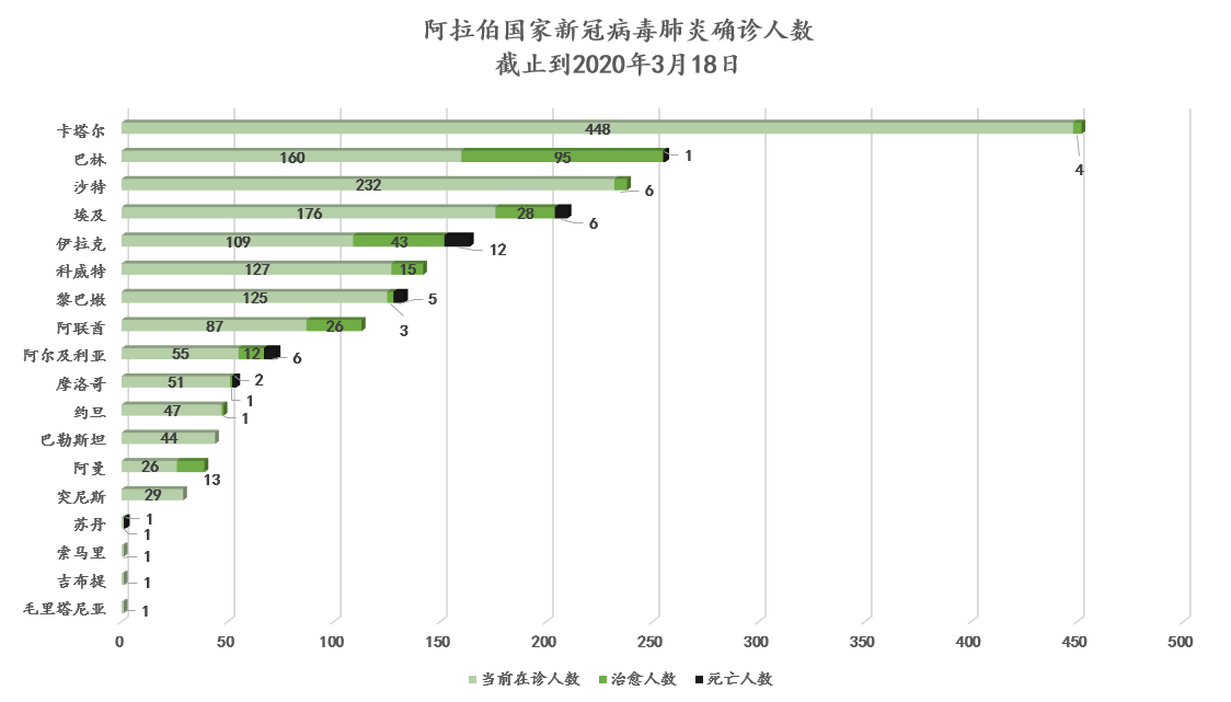 3月18日,15个阿拉伯国家出现新增病例,共计新增193例,其中沙特67例,索马里、吉布提出现首例。截至目前,除也门、利比亚、叙利亚、科摩罗4国,18个阿拉伯国家均有确诊者出现,黎巴嫩、巴勒斯坦、苏丹、利比亚已宣布国家紧急状态,多国限制公民出境,全面停飞国际航班。部分国家开通抗疫专项账户,号召全国上下团结一心,共克时艰,公职人员则带头捐款,发挥表率作用。中国政府再向黎巴嫩捐赠医疗物资,助黎渡过难关;驻毛塔大使、毛塔卫生部部长视察中国援毛塔传染病专科门诊楼项目,毛方感谢中方援建,表示该项目交付后将有效助力毛塔抗击疫情。