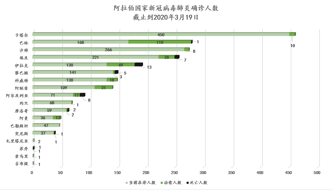 3月19日,15个阿拉伯国家出现新增确诊病例,共计新增261例,其中埃及46例,沙特36例。摩洛哥宣布进入公共卫生紧急状态,多个国家宣布实施宵禁。随着疫情蔓延,各国扩大核酸检测范围,部分国家对所有入境者实施检测。各国不断完善社会保障措施,减轻公私部门税负,动用失业保险补贴私企员工工资;捐款渠道开通后,各大银行、社会机构、公职人员积极捐款,合力抗疫。中资企业海康威视向阿曼捐赠人体测温设备,我驻科威特大使接受科电视台专访,感谢科方对中国抗疫的支持,坚信科方定能战胜疫情。