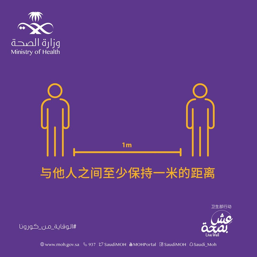 卫生部在社交媒体上发起“预防新冠,间隔一米”倡议活动,并用多种语言制作了宣传图。