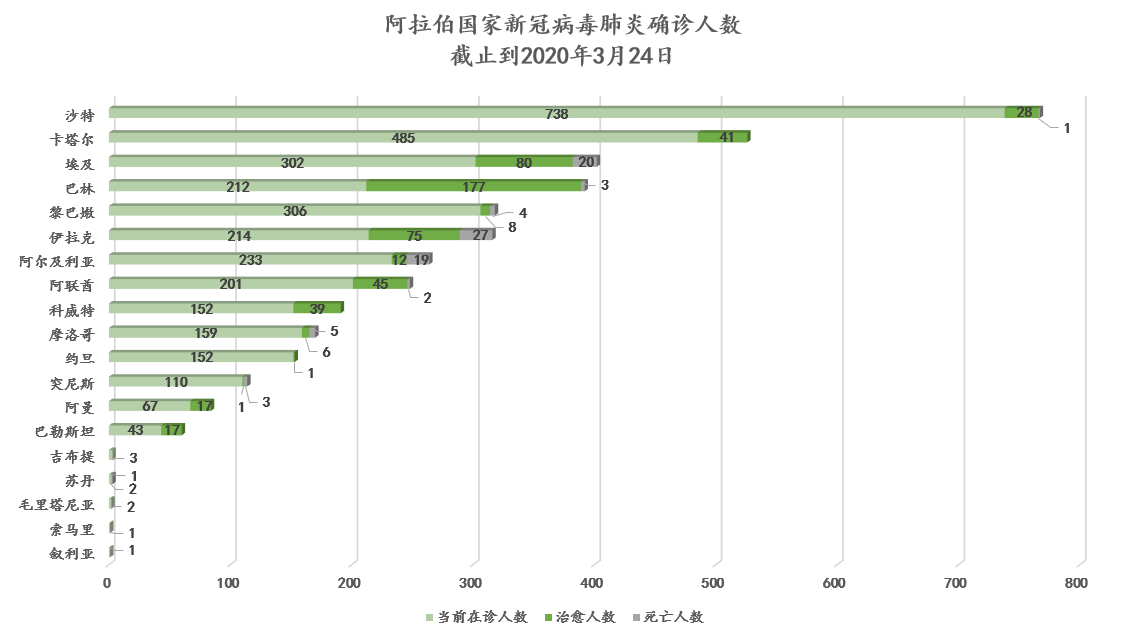 3月24日,16个阿拉伯国家出现新增确诊病例,共计新增569例,其中沙特新增205例。截至目前,阿拉伯国家累计确诊4015例,死亡85例。部分国家开始使用抗疟疾药物治疗新冠病毒肺炎。习近平主席同塞西总统通电话,感谢埃及在中国疫情期间的坚定支持,愿同埃方加强抗疫合作,早日战胜疫情。中国再向伊拉克库区捐赠检测试剂盒,中国医疗队也将抵达库区进行防疫考察。马云向苏丹捐赠防疫物资。也门社交网络掀起一场驳斥“中国病毒”言论的运动,网友表示中国是人类战胜疫情的希望之光而非病毒之源,危难时刻应摒弃敌对思想,共同应对挑战。