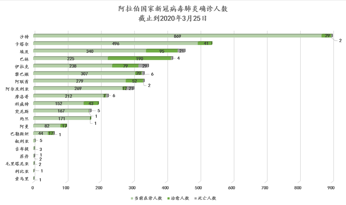 截至3月25日,累计确诊900例,治愈29例,死亡2例,其余869名患者均在医疗机构接受隔离治疗(含重症3例)。新增确诊病例中,18例为从国外返沙后即被隔离并确诊,115例为已确诊病例密切接触者。死亡病例为居住在麦加的46岁外籍人士。