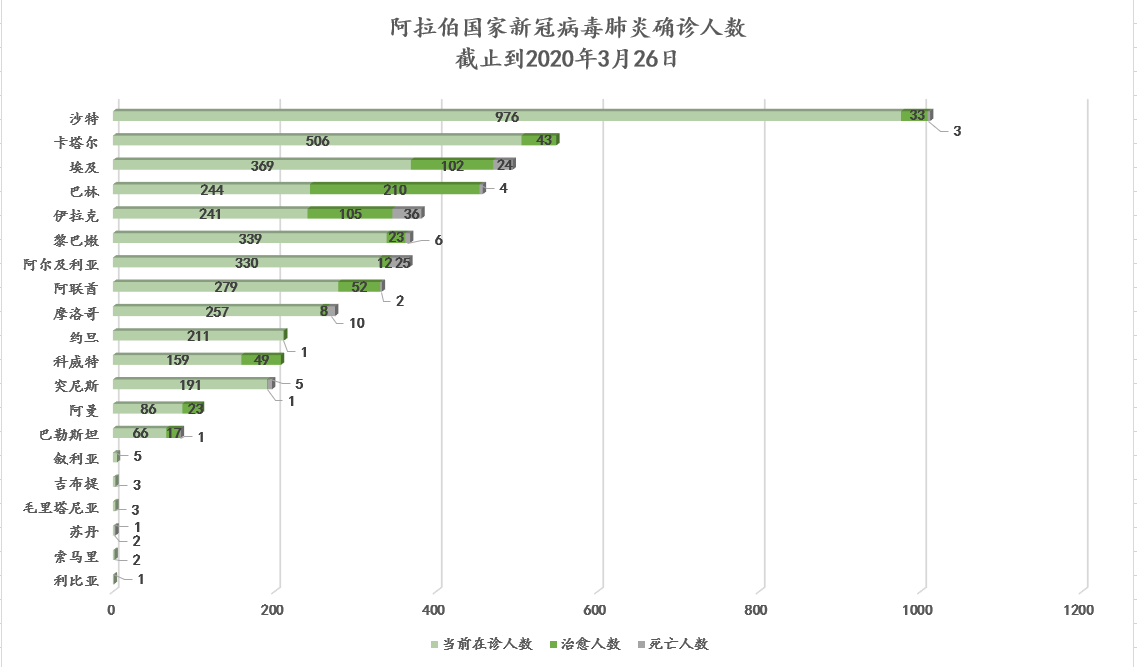 3月26日,15个阿拉伯国家出现新增确诊病例,共计新增499例。截至目前,阿拉伯国家累计确诊5066例,死亡117例。G20首开视频特别峰会,宣布启动5万亿美元计划促进市场流通,为世界经济克服疫情影响带来希望。包括中国在内的多国驻联合国代表声援叙利亚,要求取消对叙单方面制裁措施,助力叙集中力量抗击疫情。联合国、国际货币基金组织、世卫组织等国际组织积极发挥组织协调作用,发起新冠疫情全球响应计划,呼吁冲突各方停火抗疫,对部分医疗系统较脆弱的国家进行疫情考察及指导,并向部分国家提供抗疫专项资金。中国外交部主持召开西亚北非国家卫生专家新冠肺炎疫***会议,介绍中国防疫经验,18个西亚北非地区国家的卫生专家和政府官员参会。