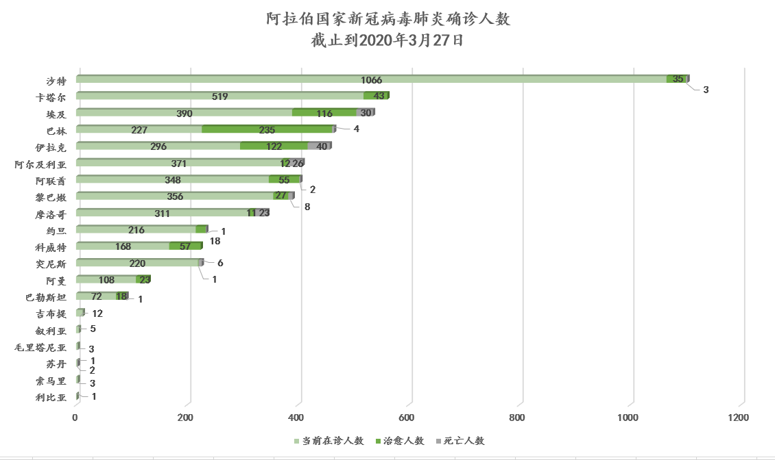 3月27日,16个阿拉伯国家新增确诊546例,累计确诊5612例,死亡145例。各国政府相继拨出援助专项资金,向贫困居民发放救助金,加强社会保障。G20特别峰会召开后,习近平主席同沙特国王萨勒曼通电话。多个国家和国际组织向医疗系统脆弱的国家伸出援助之手,或提供物资援助或提供医疗技术支持。中国援阿尔及利亚医疗物资于昨日抵达。除已采购物资投入使用之外,多国将从中国采购抗疫物资。埃及前总理认为中国积极参与国际合作,真诚为全球公共卫生事业做出贡献,彰显了人类命运共同体理念。