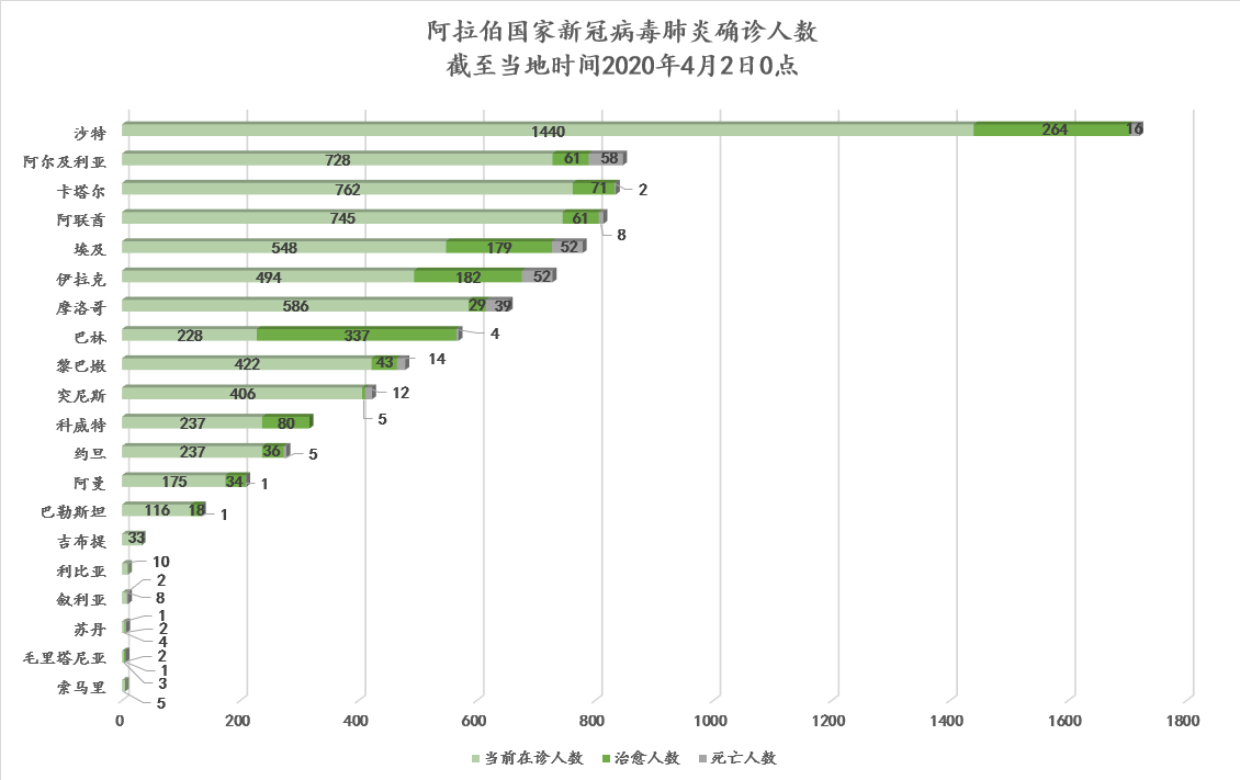 截至当地时间4月2日0点,阿拉伯国家累计确诊8859例,死亡269例,其中17个国家出现新增确诊病例共计695例。习近平主席致信利比亚民族团结政府总理,表示将与利比亚分享抗疫经验,援助抗疫物资,维护两国卫生安全。多国领导人、官员赞赏中国抗疫经验,感谢中国援助物资,提供物资采购便利。中国铁建向阿尔及利亚捐赠医疗设备。中方援毛里塔尼亚公共卫生项目提前交付。