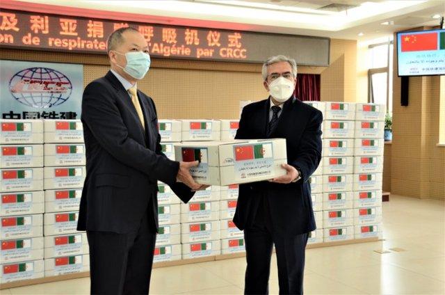 中国铁建向阿尔及利亚捐赠100台呼吸机。总统特本在新闻发布会中表示,国家医疗用品储备充足,已向中国订购1亿只口罩和3