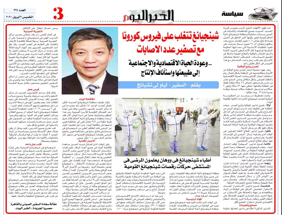 驻埃及大使廖力强在《今日消息报》印刷版和网页版同时发表文章《病例清零,有序复产,新疆疫情防控好!经济社会生活好!》,介绍新疆维吾尔自治区抗疫成果;在政论杂志《鲁兹尤素福》网页版发表文章《秉持人类命运共同体理念,共同维护国际公共卫生安全》,传达习近平主席在二十国集团领导人特别峰会上的讲话精神,赞扬埃及人民在塞西总统和埃及政府的坚强领导下透明、科学、高效的抗疫斗争;表示中方愿与国际社会一道携手抗疫,同时反对将疫情政治化、病毒标签化、对中国污名化,共同维护国际正义和良知。
