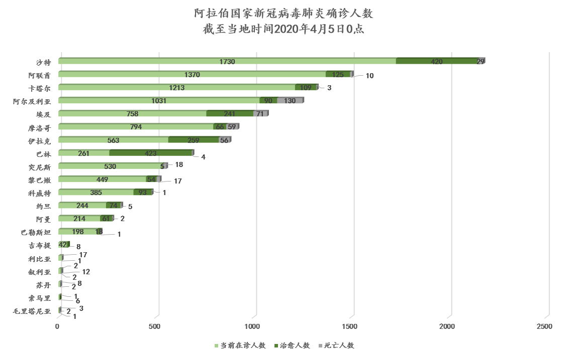 截至当地时间4月5日0点,阿拉伯国家累计确诊12291例,死亡412例,治愈2051例。其中17个国家出现新增确诊病例共计1192例。多个阿拉伯国家获得抗疫资金援助或免除债务。阿联酋正式宣布推迟2020年迪拜世博会。卡塔尔主流媒体大篇幅报道我驻卡大使以“构建中卡卫生健康共同体”为主题举行的专题记者会,高度赞赏两国外长通话对深化双边关系和开展抗疫合作的重要意义。4月4日,中国举行全国性哀悼活动,我驻外使馆降半旗、阿布扎比王储推特发文向中国抗疫斗争中逝去的医务人员表示哀悼。
