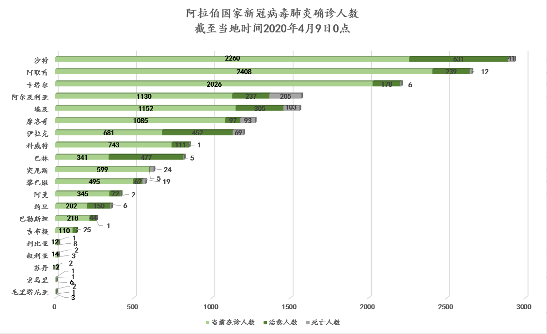 截至当地时间4月9日0点,阿拉伯国家累计确诊17535例,死亡594例,治愈3099例,其中17个国家出现新增确诊病例共计1204例。斋月即将来临,多国明令禁止斋月和开斋节期间聚餐、聚会,违规者将面临处罚。多国发起关爱贫困家庭、外籍人士的公益活动,免费向此类人群提供食品和防疫物资保障。部分北非国家获得联合国、欧盟等国际组织抗疫支持。突尼斯卫生部感谢中国物资援助。马云向约旦捐赠抗疫物资。我驻沙特、伊拉克、埃及、索马里大使受当地主流媒体邀请介绍中国防疫经验,表达加强公共卫生合作意愿,呼吁全球携手共抗疫情。